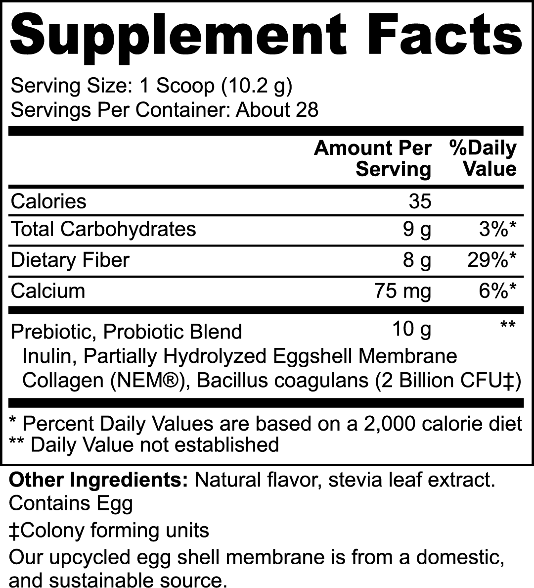 Ingredients: Prebiotic, Probiotic Blend (Inulin, Partially Hydrolyzed Eggshell Membrane Collagen (NEM®), Bacillu scoagulans (2 Bilion CFUU‡), Natural Flavor, stevia leaf extract. Contains Egg.